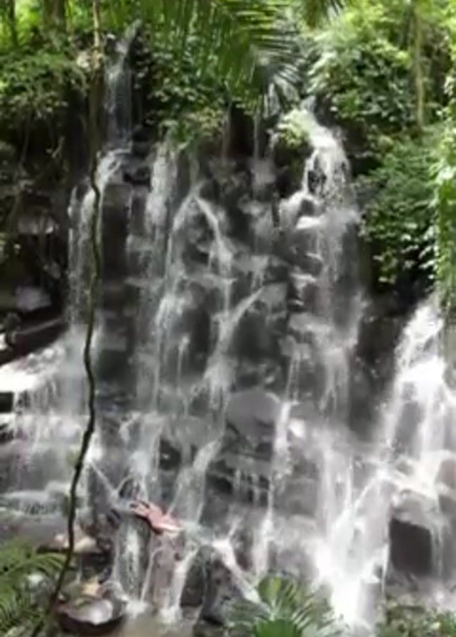 multistage waterfall in a lush, tropical environment. Water cascades down a series of dark, jagged rocks, surrounded by dense green foliage, including palm trees and ferns. A person is lying on one of the rocks near the base of the waterfall. The overall setting is natural and tranquil.