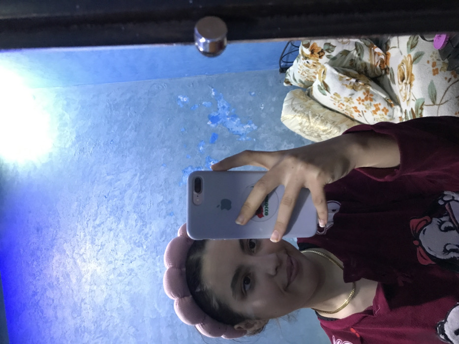 A person wearing a floral headband and a maroon shirt with cartoon characters is taking a selfie in a mirror. The phone, encased in a light purple case with a circular sticker, obscures part of the face. The mirror reflects a blue wall with mottled texture and a bright light source on the left. Pillows with floral patterns are visible in the background. A silver fixture is attached to the top edge of the mirror.
