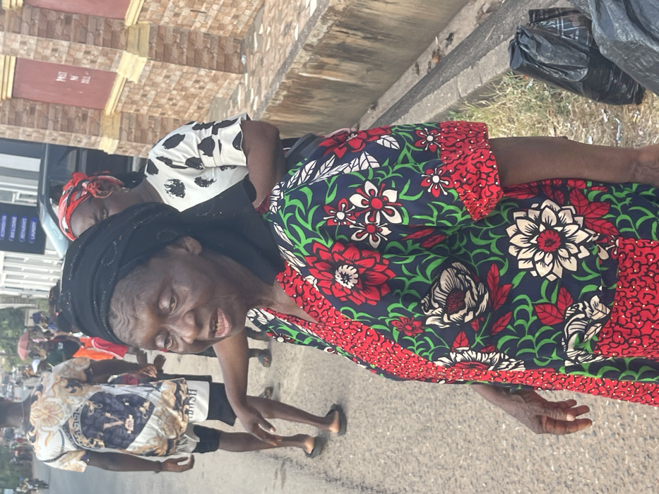 This image depicts a bustling street scene in Neni, Nigeria. The central figure is an elderly, dark-skinned woman, positioned in the mid-ground, facing slightly left. She wears a black headwrap and a brightly colored short-sleeved dress featuring a navy blue background with large red, white, and green floral patterns, accented by red borders with smaller patterns. Her mouth is slightly open, suggesting she is speaking or in mid-expression, and her face exhibits wrinkles consistent with age. To her right and slightly behind, another woman is partially visible, wearing a white shirt with black polka dots and a red headwrap. In the background, multiple individuals are present on a paved road, including a man in a white and gold patterned top and dark shorts, wearing flip-flops. The environment includes a concrete curb and a drainage channel running parallel to the street on the right. Beyond this, a building with light brown brickwork and red trim displays partial red lettering that reads "POST N TELL". Further down the street, another multi-story building with large glass windows features signs indicating "ACCOMMODATION", "BAR & LOUNGE", and "RESTAURANT". A black vehicle is parked near this building. Several black plastic bags are visible on the ground beside the drainage channel on the right.