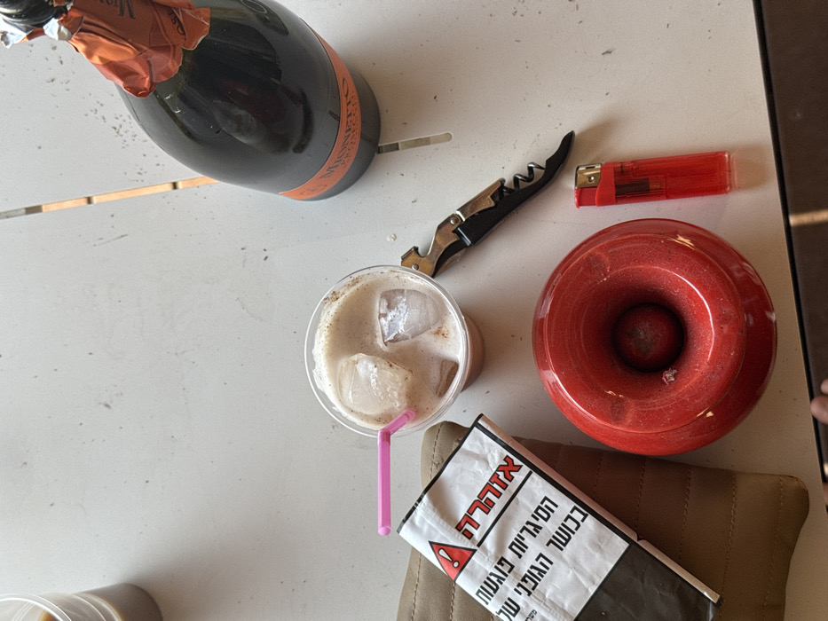 An overhead photograph depicts an assortment of objects arranged on a light-colored, possibly concrete or tiled, outdoor table surface in Tel Aviv, Israel. A clear plastic cup containing an iced, milky beverage with a dusting of cinnamon or chocolate and a pink plastic straw is centrally located. To its left, a white package, identifiable as an Israeli cigarette warning label with Hebrew text reading "אזהרה" (Warning) and "הסיגריה פוגעת בכושר הגופני שלך" (The cigarette harms your physical fitness), rests on a beige, possibly leather, item. In the upper right quadrant, a dark green bottle with an orange foil neck and a visible "Mionetto Prosecco" label stands upright. A black and metallic waiter's corkscrew lies to the right of the iced beverage. Below the cigarette warning label, a circular red ashtray with a central depression contains minor residue. A translucent red disposable lighter is situated to the right of the ashtray. A second, partially visible plastic cup containing a dark beverage is visible in the upper left corner. No individuals are present.