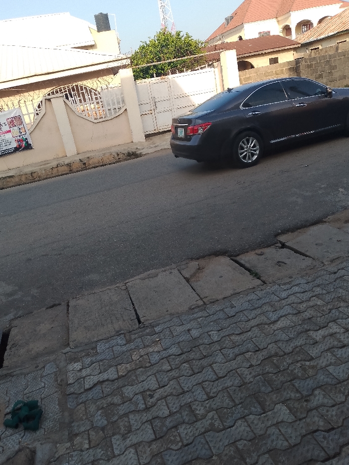 This image depicts a street scene in Lokoja, Nigeria. A dark grey sedan, identified as a Lexus by its rear emblem and wheel design, is parked facing away from the camera on a dark asphalt road. The vehicle displays a Nigerian license plate, dark green with white text. Adjacent to the road, a concrete drainage ditch is covered by three rectangular concrete slabs. Beyond the drainage, a sidewalk is paved with grey interlocking pavers arranged in a basketweave pattern. A crumpled dark green object, possibly fabric or plastic, lies on the paved sidewalk in the lower-left foreground. In the mid-ground, a cream-colored perimeter wall with decorative curved elements and barbed wire on top defines a property boundary. A white metal gate is integrated into this wall. A partially visible sign on the wall shows the text "S'S AGE". Directly behind this wall, a dense green tree partially obscures the background. Further in the background, residential buildings are visible. One building on the left has a white roof with a black water tank on its upper level. Another building on the right features a reddish-brown tiled roof and cream-colored walls. A tall, white metal lattice tower, consistent with a telecommunications mast, is partially visible against a light blue sky in the far background. No individuals are present in the image, and no specific actions or interactions are ongoing. The scene is illuminated by natural daylight, suggesting clear weather conditions.