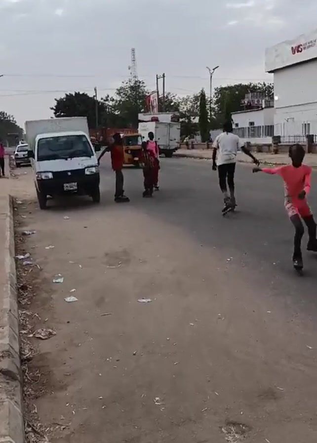 several young people rollerblading on a street in what appears to be a city. A small white van is parked on the side of the road. There are buildings on either side of the street, one of which has the word "apollo" on it. The sky is overcast. At one point, one of the children falls while rollerblading and takes off his skates. A yellow auto rickshaw is visible in the background. There is litter along the curb.