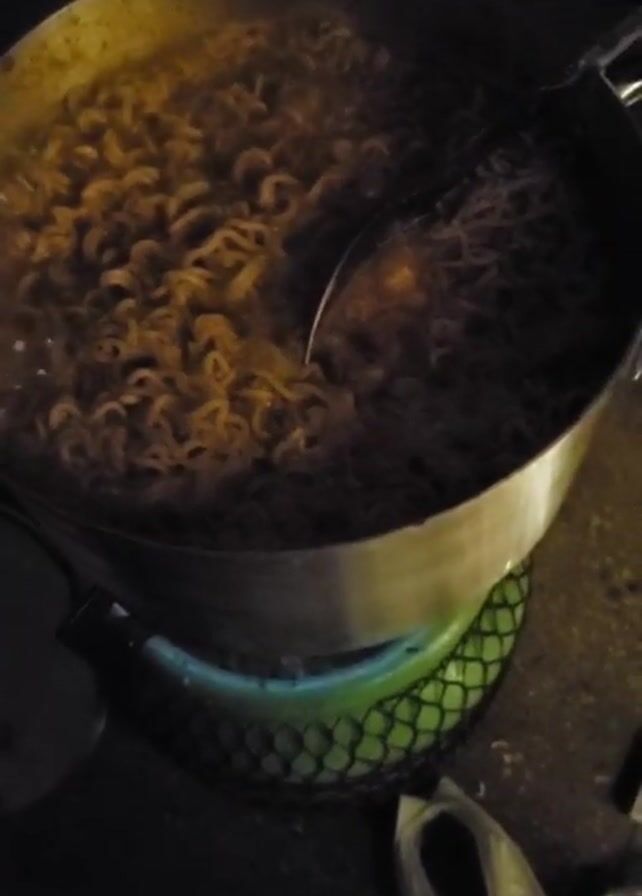 A video shows a large pot of noodles cooking on a small portable stove with a green mesh exterior