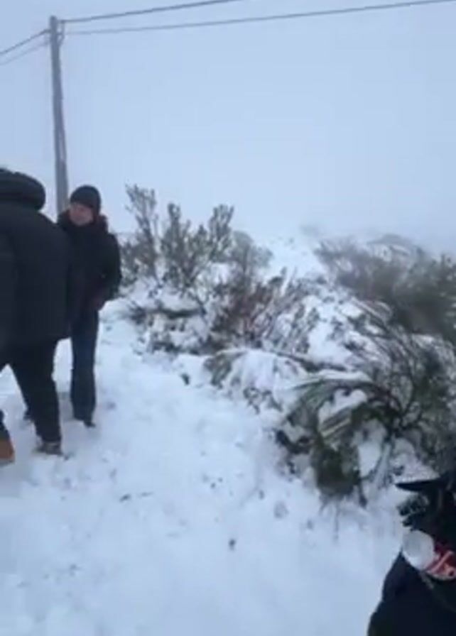 snowy scene with three people, two of whom are visible from the waist up