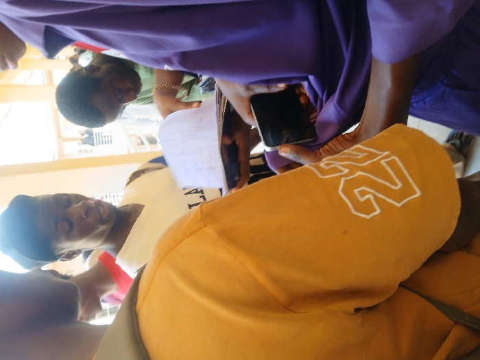 The scene, reportedly in Ugi Majowel, Nigeria, depicts a group of at least five individuals gathered in an indoor or covered outdoor setting. In the immediate foreground, the back of a person wearing a mustard yellow short-sleeved shirt with "22" outlined in white on the right sleeve is partially visible. Central to the image is a young man with dark skin, wearing a white sleeveless top with visible dark lettering (partially reading "LA") and a dark cap, looking downwards with his mouth slightly open. To his right, a person in a purple shirt holds a black smartphone horizontally in their right hand, while their left hand is positioned near a stack of white papers or a booklet. Further to the right and slightly behind, another young man in a green shirt, wearing a gold-colored bracelet on his right wrist, leans forward, also observing the papers. Multiple indistinct figures are present in the background, along with architectural elements such as light-colored pillars and railings. The primary action involves multiple individuals collectively viewing and interacting with shared documents.