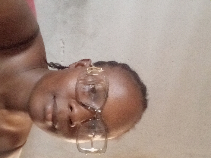 The image depicts a close-up portrait of an individual, identified as located in Sabon Tasha, Nigeria. The subject is an adult female with dark skin and dark, braided hair styled off her face. She is wearing large, rectangular-framed eyeglasses with translucent light brown frames and a visible gold-colored F-shaped emblem on the left temple arm. Her eyes are directed towards the viewer, and her expression is neutral. She appears to be wearing a dark, possibly strappy, garment, with a glimpse of a shoulder visible on the left. The background consists of a plain, light-colored wall with minor textural variations and faint marks, indicative of an indoor environment. No other individuals or objects are discernible.