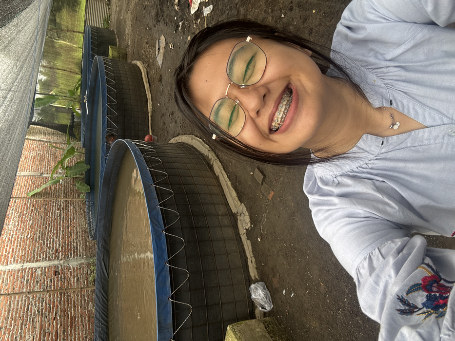 A smiling woman wearing glasses and braces poses for a selfie. Behind her are several round fish tanks filled with murky water. These tanks have a black grid-like structure with blue edging. A brick wall stands next to one tank, and some plants grow nearby. The ground is muddy and strewn with debris. The woman is wearing a light blue button-down shirt with embroidered floral designs on the sleeve.