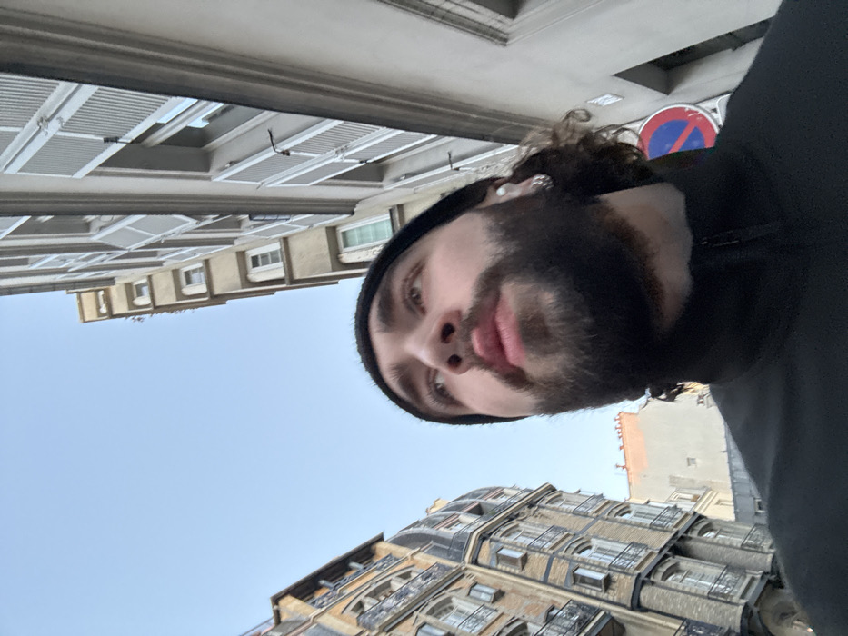 The image presents a low-angle, upward-facing view of a street scene in Paris, France, dominated by an adult male in the foreground. The central figure is a male with a dark, full beard and mustache, dark hair partially visible beneath a black beanie, and brown eyes. He wears a black zippered jacket or top and a silver-colored stud earring in his left ear. His head is tilted back, and his gaze is directed upwards and to the left, with his lips slightly parted. The background features typical Parisian urban architecture under a clear, light blue sky. To the left, a multi-story building of light-colored stone or stucco exhibits several levels of curved balconies with ornate dark railings and a distinctive dark roofline, suggestive of Haussmannian design. To the right, a taller, lighter-colored building displays multiple windows with closed, louvered white shutters. A fragment of a circular European street sign, red with a blue interior and a red diagonal line, indicating "No Stopping" or "No Parking," is partially visible behind the male's right shoulder. In the mid-distance, between the two prominent buildings, another light-colored structure with a reddish-brown rooftop edge is discernible.