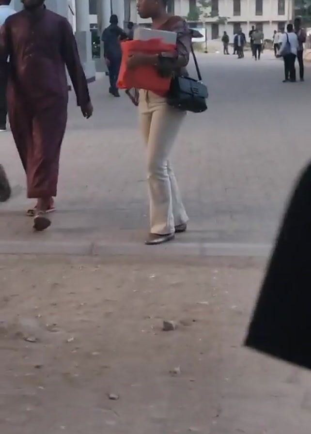 person in a black t-shirt walking on what appears to be a campus or public space. In the background, there are other people walking and standing around a building with multiple windows. There's a woman in the foreground, wearing light-colored pants and carrying papers, a red folder and a black purse. Other details include motorcycles parked along a wall, and a vehicle on the right edge of the frame. The overall setting suggests a somewhat busy outdoor environment, possibly near an educational institution. The person filming is walking in the same direction as the woman carrying the papers and folder.