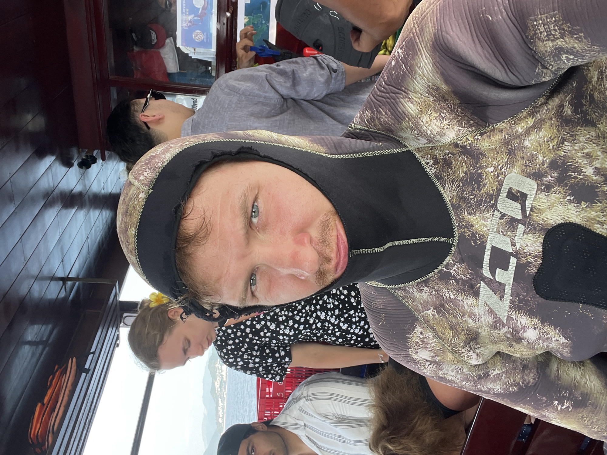A man in a brown and black camouflage wetsuit takes a selfie. Several other individuals sit or stand behind him. One is wearing a light gray shirt, another has a black and white patterned dress, and a third has a striped shirt. The background includes a glimpse of water and land, suggesting a boat ride. Red crates are visible, along with the wooden interior of the boat.