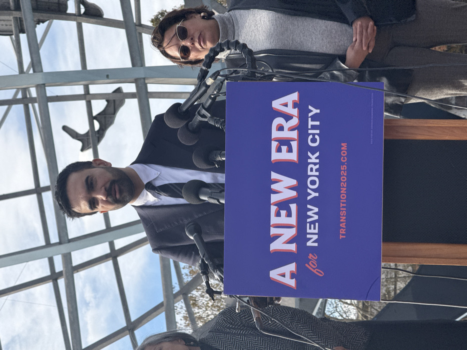 An outdoor public address is underway in Flushing Meadows-Corona Park, Queens, New York City. A bearded man, wearing a dark suit, white shirt, and dark striped tie, stands centrally behind a wooden podium equipped with multiple microphones. A blue sign on the podium displays "A NEW ERA for NEW YORK CITY" in white and red lettering, with "TRANSITION2025.COM" printed below. To the speaker's right, a woman in a grey turtleneck, dark jacket, and sunglasses stands with clasped hands. To his left, a partially visible woman in a dark, patterned jacket is present. The background reveals a large, metallic, skeletal architectural structure set against a partially cloudy sky.