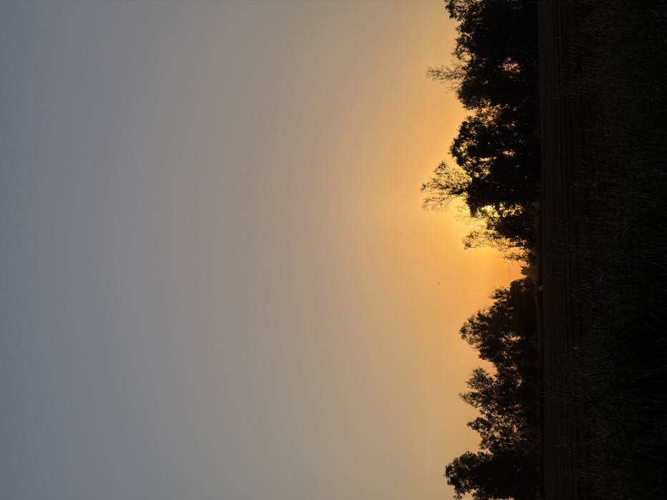 A tranquil sunrise paints the sky with hues of orange and grey. Silhouetted trees and tall grasses line the right edge, their dark forms contrasting against the radiant horizon. The sun's glow filters through the branches, creating a soft, ethereal light. The vast expanse of the sky dominates the scene, suggesting a serene and expansive landscape.