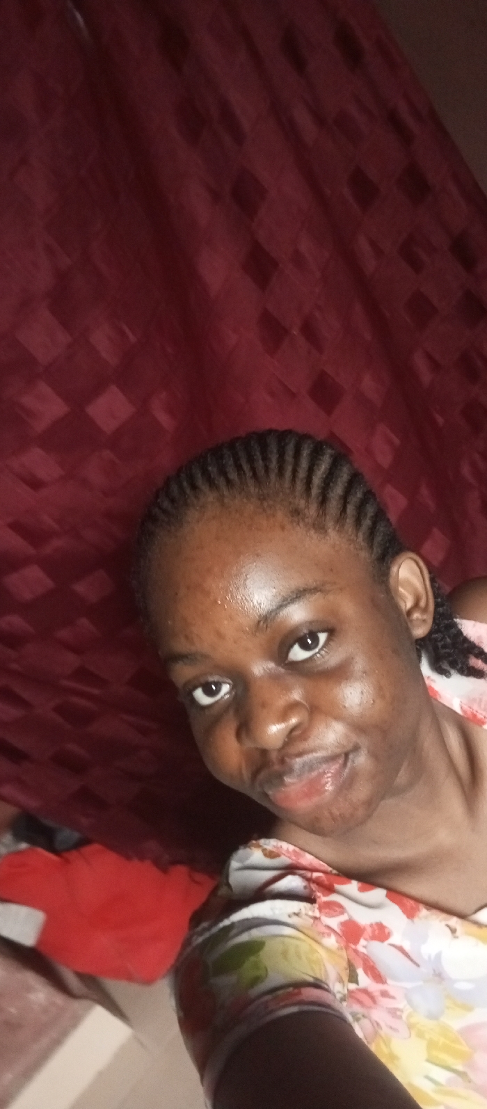 A young Black woman with braided hair smiles into the camera. Her skin appears dewy, and she wears a floral top with short sleeves. Behind her is a patterned burgundy curtain. Part of a red blanket or garment is visible near the bottom left of the frame.