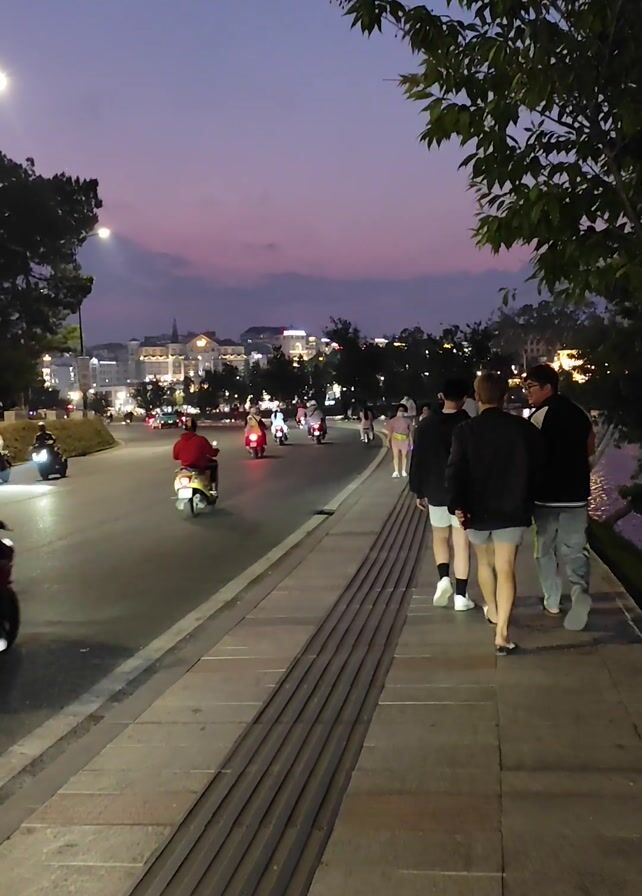group of people standing on a sidewalk next to a street with motorcycle traffic. The sky is a twilight hue, transitioning from purple to a darker evening sky. The people on the sidewalk appear to be observing the street scene. The street is illuminated by streetlights and the headlights of the motorcycles. The foreground includes a tree with green foliage and a ledge with metal slats. In the distance, buildings with lit windows can be seen. The camera angle is slightly tilted, making the scene appear vertically oriented.