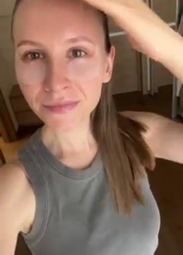 A light-skinned woman is centered in a medium shot, indoors. She wears eye patches and a grey tank top. She wears her light brown hair pulled back into a ponytail. She smiles softly, touches her hair, puts her hand to her forehead, and blows a kiss to the viewer. A closet door is visible in the background. The shot has a slightly upward angle.