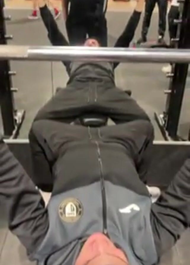 A man is bench pressing on a Smith machine in a gym. A person in a black tracksuit lays on top of him for added weight. The man lifting groans with effort. Another person stands in the background filming with a phone. Other people are present in the gym.