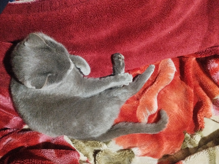 - "A gray cat lies curled on a red and reddish-orange blanket" by FM-wMfOW2, licensed under CC BY 4.0