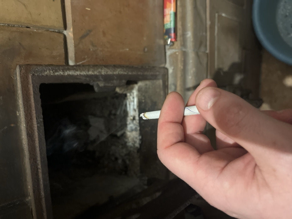 The scene depicts an indoor environment, within what appears to be a residential or domestic setting. While the requested location is Liepaja, Latvia, the image itself contains no identifiable features to corroborate this specific geographic information. In the foreground, a human hand, exhibiting skin tone consistent with a Caucasian individual, holds a partially consumed, lit cigarette between the thumb and forefinger. The cigarette is white with a subtle blue or grey patterned design near the filter end. Its tip glows orange, and a column of ash is visible. Wisps of smoke are emanating from the cigarette. The background features the open combustion chamber of a tiled stove or fireplace. The chamber interior is dark, containing a substantial accumulation of ash and indeterminate burnt debris, with faint traces of smoke rising within the opening. The perimeter of the opening consists of dark, likely cast-iron, components showing signs of age and wear. The structure surrounding the combustion chamber is composed of light brown or reddish-brown ceramic tiles with visible grout lines. A tiled hearth or base extends forward from the stove structure. To the right of the stove's opening, resting on the tiled hearth, is a multi-colored disposable lighter, displaying vertical stripes of red, orange, green, and blue. Partially visible in the lower right corner is a dark blue or green plastic bucket containing a light-colored substance, likely ash or another granular material.