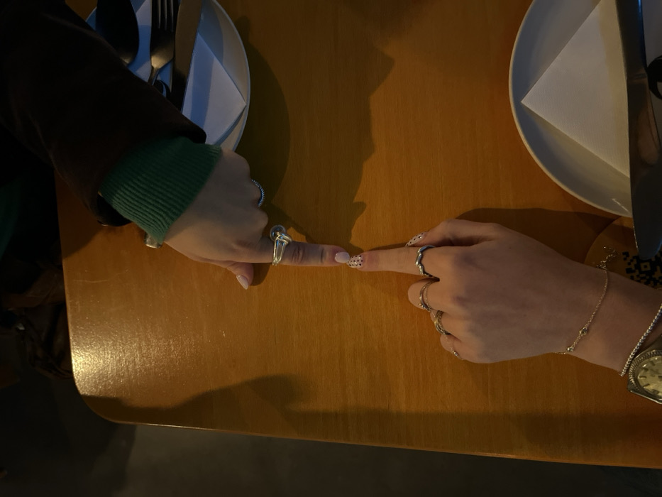 The scene is captured from an overhead perspective, depicting an interaction between two hands on a polished, light-brown wooden table within what is identified as a location in Antwerp, Belgium. The upper hand, extending from the top-right of the frame, is a right hand with its index finger pointed directly downwards. This finger displays a prominent silver-toned ring with a knot design. A subtle beaded silver-toned ring is on the ring finger. The wrist is partly obscured by a dark brown outer sleeve, revealing a ribbed green sleeve beneath. The lower hand, extending from the bottom-left, is a left hand with its index finger pointed directly upwards, making contact at the fingertip with the upper hand's index finger. This hand wears a silver-toned twisted ring on its index finger, and multiple gold-toned rings on its middle finger. A delicate gold-toned chain bracelet is on the wrist, along with a gold-toned watch featuring a textured face and a silver-toned beaded bracelet. The index fingernail of this hand is painted with light polish adorned with small black polka dots. The wooden table surface is smooth with minor abrasions. Overhead artificial lighting casts distinct shadows of the hands and fingers onto the table. Portions of two white or light-colored plates are visible: one at the upper-right edge, containing dark-handled cutlery (a knife and fork) and a neatly folded white napkin; another, partially visible, at the lower-right edge. The background is dark and out of focus.