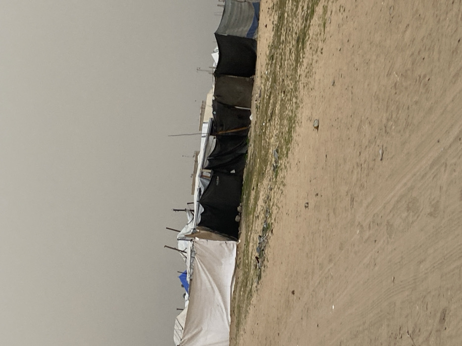 Makeshift dwellings line a dirt path under an overcast sky. Structures appear to be constructed from tarps and various materials. The ground alongside the path shows sparse vegetation and scattered debris. The overall atmosphere suggests a temporary or impoverished settlement.