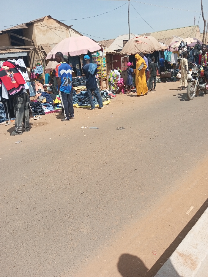 The image depicts an outdoor street market scene in Akwanga, Nigeria, under bright daylight