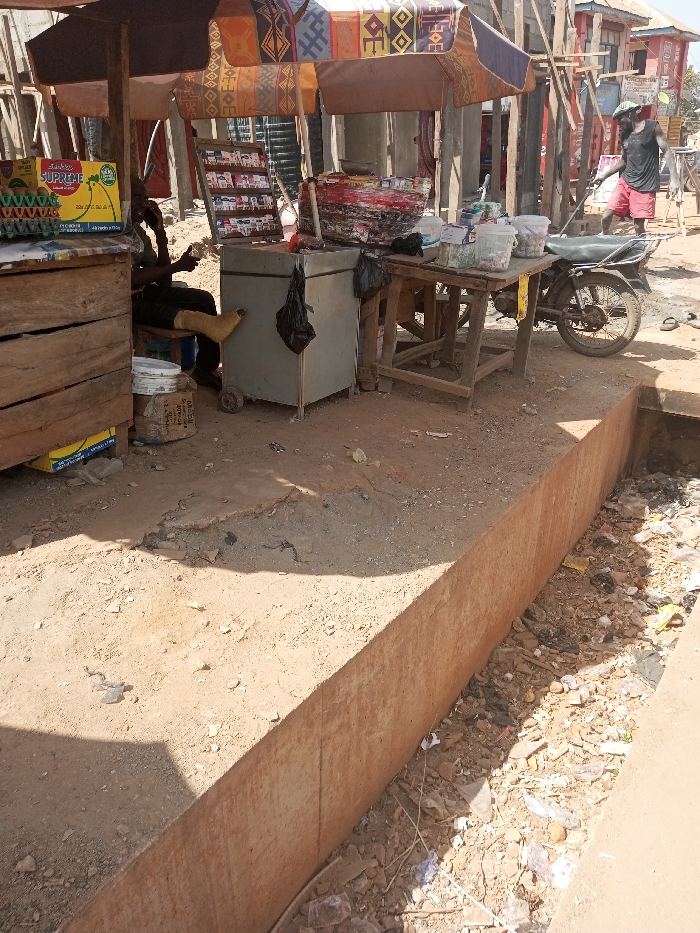 This image depicts a roadside market scene in Akwanga, Nigeria, under bright daylight. In the foreground on the right, an open concrete drainage ditch filled with various litter and debris runs horizontally across the frame. The ground leading up to the ditch is unpaved, dusty reddish-brown earth with scattered small rocks. In the mid-ground, a vendor's stall is set up under a large, square-ish umbrella featuring patterned fabric in brown, orange, black, yellow, and white geometric designs. To the left, a wooden counter with multiple drawers displays an "Supreme Eggs" carton. Partially obscured behind this counter, a dark-skinned individual wearing dark clothing and a light-colored cast or boot on their right leg is seated on a low stool, appearing to interact with an object held in their hand. Adjacent to the seated person, a gray, rectangular metal cabinet or cooler on wheels has a black plastic bag hanging from its side. Behind this cabinet, a display rack holds numerous small packaged items. To the right of the cabinet, a wooden table supports several clear plastic containers filled with small items, along with other merchandise. A dark-colored motorcycle is parked next to this wooden table. In the background, on the right side, another dark-skinned individual wearing a black shirt, red shorts, and a green cap walks towards the right, holding a long stick or pole. The background also reveals partially constructed or dilapidated buildings with exposed wooden scaffolding and concrete columns, suggesting an urban or semi-urban environment. Shadows indicate a sunny day.