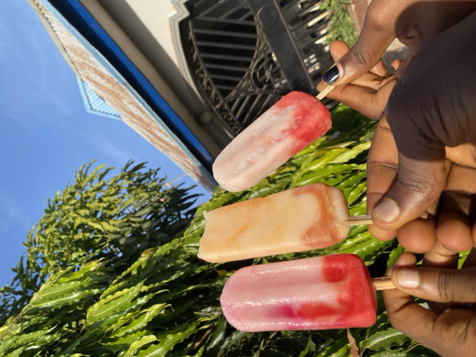 Three dark-skinned hands are positioned prominently in the lower frame, each holding a distinct popsicle on a wooden stick, outdoors in Narayi, Nigeria