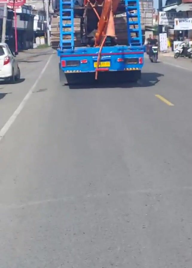 rear view of a blue flatbed truck carrying an orange excavator down a gray asphalt road. The excavator is secured to the truck, with its arm extending towards the back. The truck has a black cage at the top of the flatbed. The license plate of the truck is visible, but the letters and numbers are not clear. On the right side of the road, there are parked vehicles, a small yellow truck, and various buildings. On the left side of the road, there's a white car, a sign with a red circle and white text, and utility poles with power lines. A person on a motorcycle passes the truck on the right. The sky is blue with scattered clouds. The road has a solid white line on the left and a broken yellow line in the center.