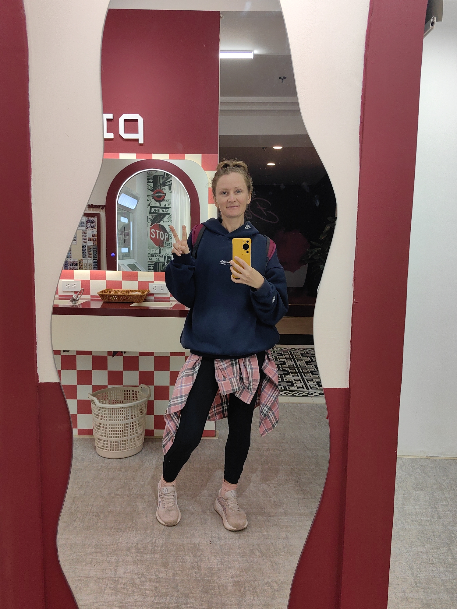 A light-skinned female subject with light brown hair pulled into a bun is captured in a full-body mirror selfie. She is wearing a navy blue hooded sweatshirt with a white logo partially visible as "Vinam... Sa Pa," a pink and white plaid shirt tied around her waist, black leggings, and light pink athletic shoes with matching socks. Her right hand holds a bright yellow smartphone to take the picture, while her left hand forms a peace sign. The scene is an interior space in Sa Pa, Vietnam. The subject is reflected in a large, irregularly shaped mirror framed by a broad red border against a white wall. The reflected background reveals a vanity area with a white countertop and a red and white checkerboard tiled backsplash. Electrical outlets are visible on the backsplash, and a small, brown wicker basket rests on the countertop. Below the vanity, the red and white checkerboard pattern continues on the wall. A light-colored plastic laundry basket is positioned on the light gray, textured floor to the subject's left. Above the vanity, a smaller, arched mirror with a red frame reflects multiple street-themed signs, including "ONE WAY," "STOP," "UNDERGROUND," "COLLEGE ST," "MAIN," and "ROAD," suggesting a themed decor. A partial sign displaying white letters "oca" is visible on the red wall above the main mirror.