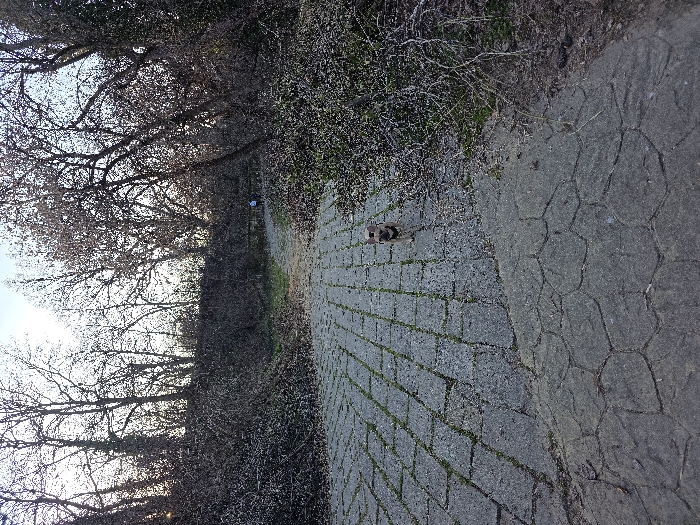 The image depicts an outdoor scene within a historical park in Hisarya, Bulgaria, likely a section of its ancient fortifications. The foreground features a dark gray paved surface composed of irregular, large polygonal blocks. This transitions into a lighter gray pathway constructed from rectangular paver blocks, with sparse green vegetation visible in the interstices, extending into the background. A small, light brown and black brachycephalic dog, wearing a dark chest harness, is positioned centrally on the rectangular paver path, facing the viewer. Dense, predominantly leafless deciduous trees and tangled undergrowth line both sides of the paths, covering elevated terrain consistent with ancient walls or ramparts. Patches of green vegetation are sparsely visible closer to the path in the background. In the distant background, two human figures are discernible on the pathway, appearing to walk away from the viewer; one figure wears a light-colored upper garment. The sky above is clear and bright, visible through the bare tree canopies, indicating a season without full foliage.