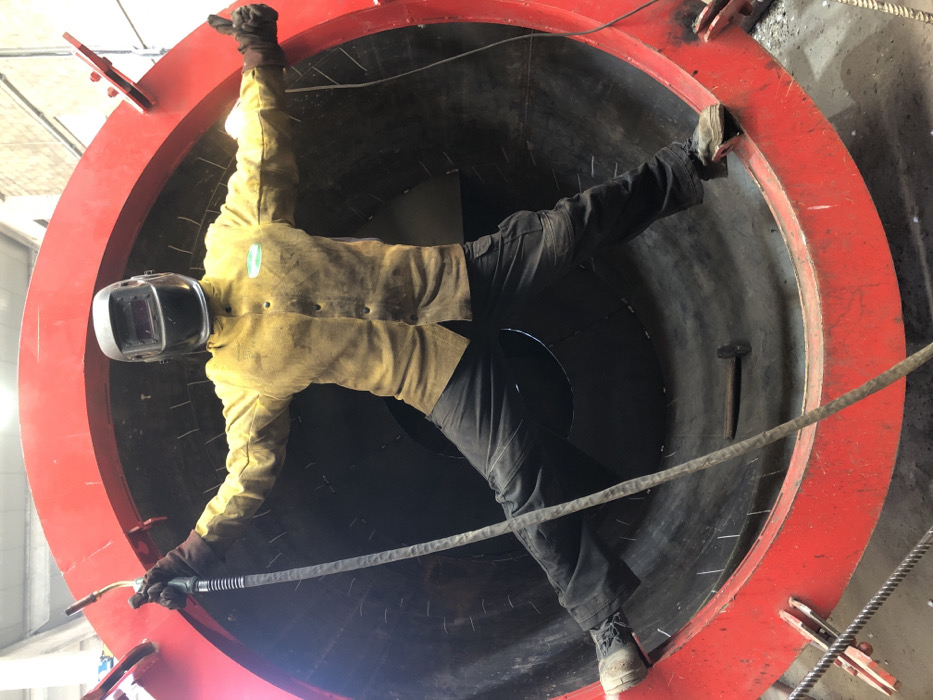 A lone individual, identified as a welder, is positioned inside a large red cylindrical metal structure in an industrial workshop located in Čeluga, Montenegro
