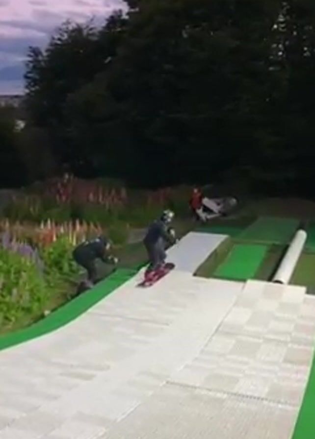 n outdoor setup for what appears to be snowboarding or a similar sport on an artificial surface