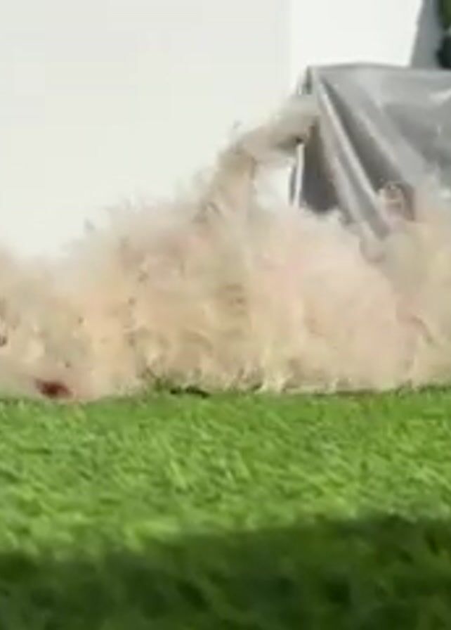- "A small, white, fluffy dog lies on its back on bright green artificial turf, facing the camera initially, then rolling from side to side" by FM-avfjN2, licensed under CC BY 4.0