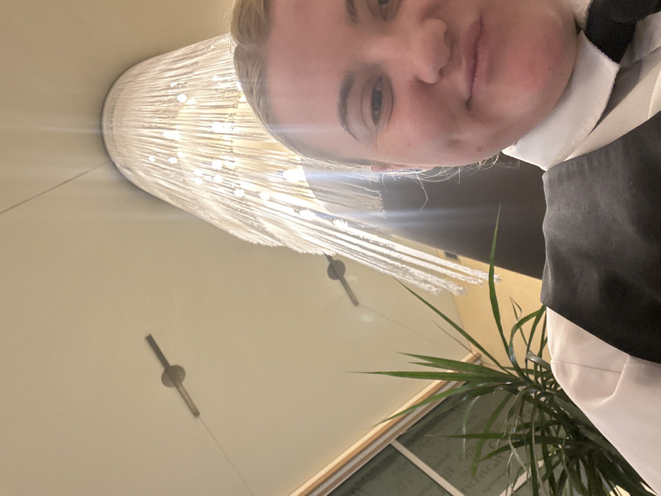 A female individual is depicted in a selfie, positioned in the foreground and occupying the right half of the frame. She has light skin, blonde hair (visible at the top of her head), and a slight smile or smirk with dimples visible on her cheeks. She is wearing a white collared shirt, a black waistcoat, and a black tie, suggesting a uniform. The background shows an interior setting, identified as a location within the city of Obrochishte, Bulgaria. A large, ornate chandelier with numerous illuminated elements hangs from the ceiling in the upper-right quadrant. To the left of the chandelier, two smaller, circular light fixtures are suspended from the light-colored ceiling. A tall, green, spiky-leaved plant is visible in the lower-left, and a window or door frame with a light-colored border is present in the far left background. The overall lighting appears artificial, originating primarily from the chandelier and other ceiling fixtures.