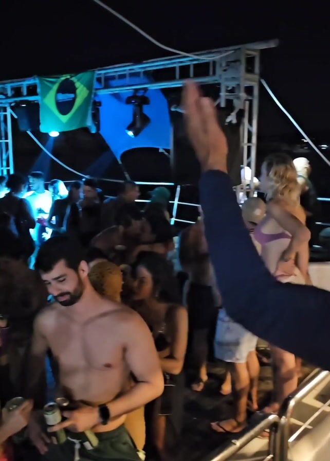 crowded party on a boat at night. People are dancing and socializing under blue lights. Some individuals are shirtless, while others are wearing swimwear. There is a Brazilian flag hanging on the structure above the crowd. Some people are holding drinks, and the atmosphere appears lively and festive.