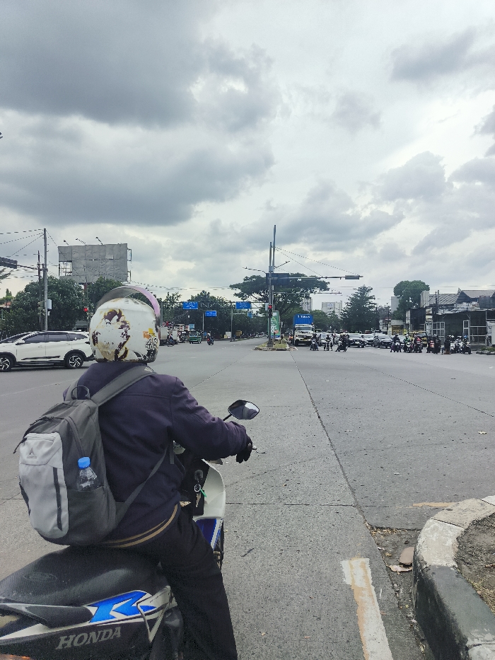 A person on a Honda motorcycle waits at a busy intersection. The rider wears a helmet and a backpack with a water bottle. Multiple vehicles and other motorcycles are stopped at the intersection's traffic lights. The sky is overcast with heavy clouds. Buildings and trees are visible in the background along with a billboard. The scene appears to be in a bustling urban area.
