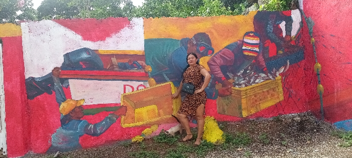 A woman in a leopard print dress stands in front of a painted mural. The mural depicts several scenes: people unloading boats and working with fish. The scenes are rendered in a colorful, slightly abstract style with red, yellow, and blue prominently featured. The mural appears to be on a wall outdoors, with greenery visible above and in the foreground. A small dog is near the woman's feet.