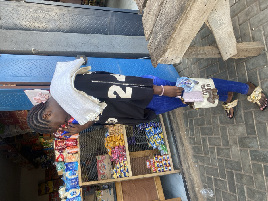 An individual stands outdoors in front of an open-front retail stall in Kaduna South, Nigeria. The person, appearing to be a young woman with braided hair (cornrows), wears a black long-sleeved top featuring a large "24" graphic in off-white on the right side and vertical zippers on the sleeves, paired with blue jeans. A white, textured towel is draped over her left shoulder and neck. She wears gold-toned flat sandals. In her right hand, she holds a light-colored, bucket-style handbag with "MIN MIN" text and a brown dog-shaped charm. The bag contains a light purple wallet-like item and a clear plastic bag holding multiple small, clear sachets, possibly water. Her right wrist displays a light pink beaded bracelet. Her head is bowed forward, and she holds a blue device, possibly a mobile phone, near her right ear/cheek with her right hand. To the individual's left, the retail stall features wooden shelves with wire mesh, extensively stocked with packaged consumer goods. Visible items include various brands of biscuits, popcorn, and other snack items in colorful wrappers and boxes. Directly behind her, a section of an interior wall or another display is visible with more products. To the individual's right, a blue metal door with a diamond plate texture is partially visible, suggesting an entrance or shutter. Adjacent to this door is a dark gray vertical structural element. Further right, a rustic wooden table or bench, constructed from rough, unpainted planks, is positioned. The ground throughout the visible area is paved with dark grey interlocking concrete blocks arranged in a herringbone pattern. A discarded clear plastic bottle lies on the ground near the individual's feet. The scene is illuminated by natural daylight.