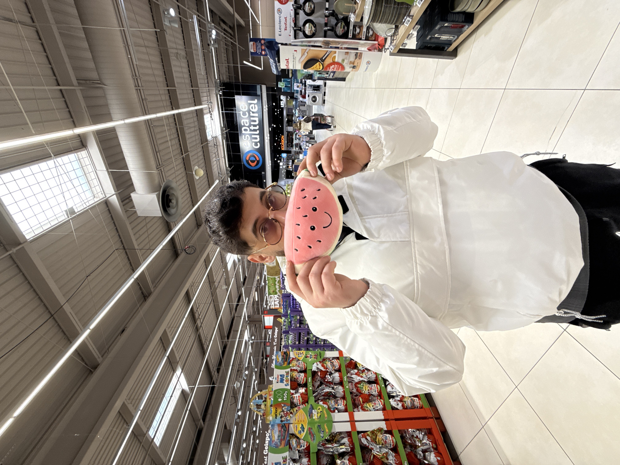 The image depicts a male individual in an E.Leclerc hypermarket located in Geispolsheim, France. The man, with dark hair and wearing amber-tinted, round-framed glasses, is centered in the frame. He wears a white anorak-style jacket with a drawstring and black trousers. He holds a pink, watermelon-shaped plush object featuring a black smiley face in both hands, positioning it in front of his chin. The environment is a retail aisle with a light-colored tiled floor. To the left of the man, a prominent display features Kinder Maxi Surprise eggs, with "Mickey" and "Hot Wheels" branding visible. A partially obscured sign above this display reads "Mon Magasin C'est Geispo." To the right, another aisle displays cookware, including Tefal frying pans. In the background, a large sign overhead reads "Espace Culturel" with the E.Leclerc logo, marking a cultural goods and electronics section. Beyond this sign, a person pushing a shopping cart and various appliances (including washing machines) are visible. The ceiling is high, industrial-style, featuring exposed beams, corrugated panels, linear fluorescent lighting, multiple skylights, and visible air ducts.