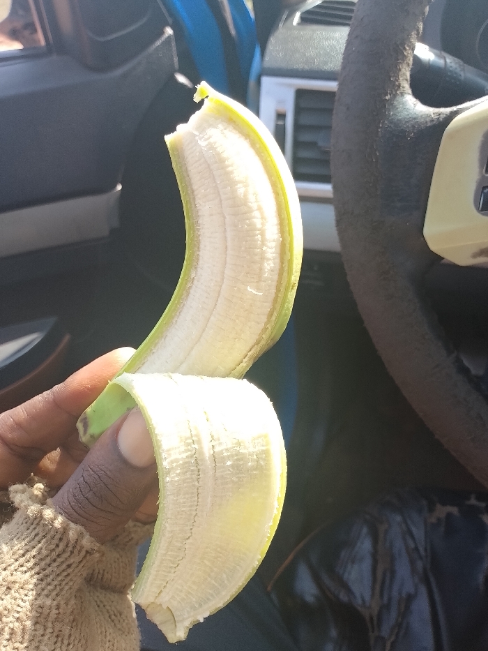 A close-up image depicts a dark-skinned hand, partially covered by a light brown knitted sleeve, holding a partially peeled, ripe banana inside a vehicle