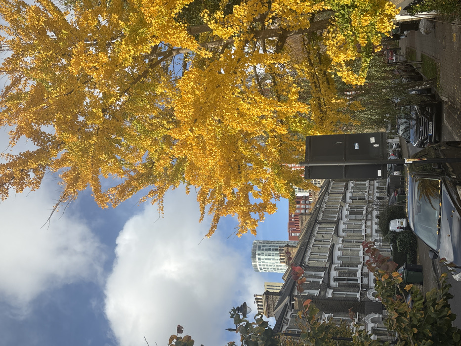 The image depicts an autumnal street scene in the White City area of London, United Kingdom. The foreground is dominated by a large Ginkgo Biloba tree on the right, displaying vibrant yellow foliage under a partly cloudy blue sky with white cumulus clouds. To the left, a row of traditional multi-story Victorian or Edwardian terraced houses with bay windows and dark brick facades lines the street. A classic black streetlamp is visible above the rooftops of these houses. In front of the houses, green waste bins are present, and smaller trees with reddish-brown autumn leaves add color. The road runs from the foreground towards the mid-ground, with several vehicles parked along the left side. A dark sedan is partially visible in the immediate foreground, and a dark Hyundai Tucson SUV (license plate BD65 DGE) is parked further down. A white van is also visible further along the street. A dark, rectangular street sign post stands in the mid-ground, partially obscured by the yellow tree. In the background, rising above the terraced houses, are several modern high-rise buildings. A prominent, light-colored, cylindrical building with horizontal bands is visible in the center-left background, characteristic of contemporary developments in the White City area. Reddish-brown modern structures are also discernible to its right. The pavement runs along the right side of the street beneath the yellow tree. No individuals or specific actions are depicted.