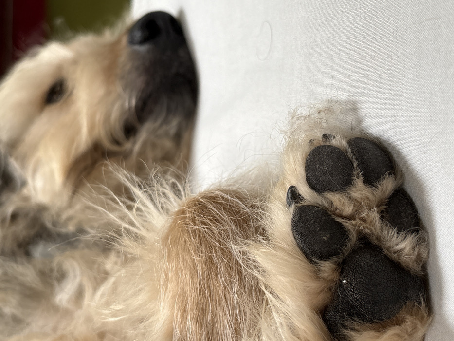 A close-up image displays a light brown, shaggy-haired dog resting on a white, textured fabric surface. The dog's left front paw is in sharp focus in the lower-left foreground, revealing dark, multi-lobed paw pads with visible dark claws partially obscured by fur. Light brown hair with lighter tips extends between and around the pads. The dog's head, including its muzzle and nose, is visible in the blurred background, positioned to the upper right, indicating the animal is lying down. The visible setting is consistent with an indoor environment. No identifiable elements within the image indicate a specific location in the city of Barcelona, Spain.
