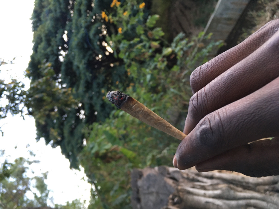 A hand holds a lit, brown cigarette or joint. The hand is dark-skinned, and the fingers are slightly bent. The tip of the cigarette is glowing orange with a gray ash covering the end. The background is a blur of green trees and leaves with a hint of sky visible in the lower left corner and an object of wood in the lower right.