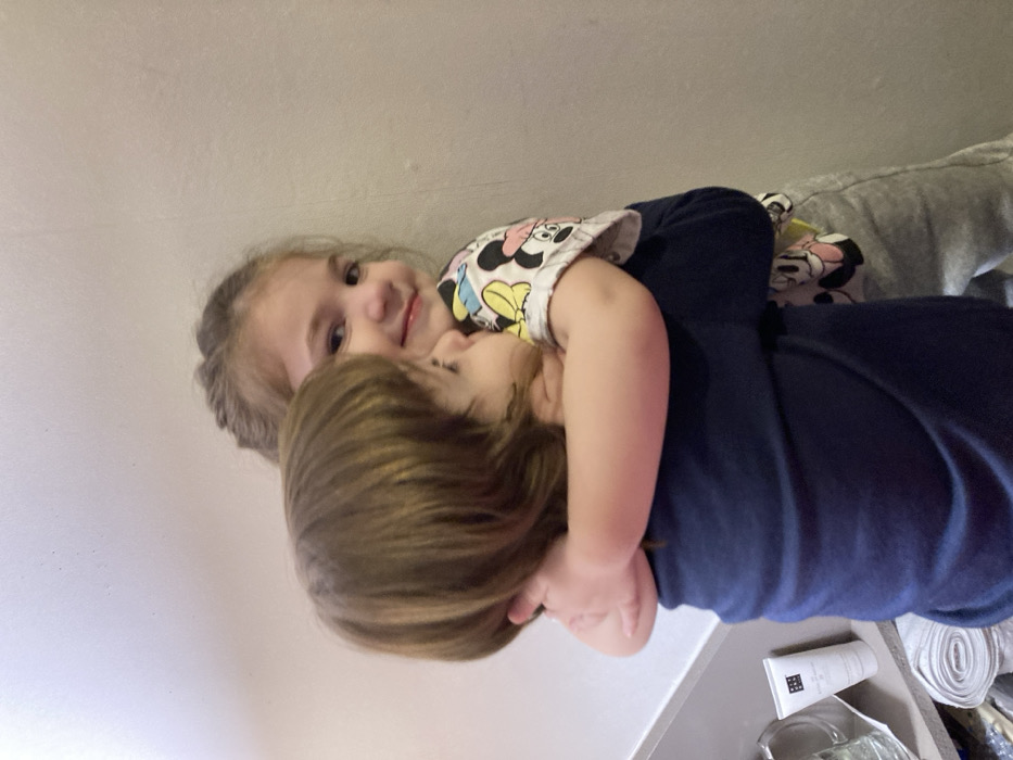 Two young children are closely embracing, possibly siblings