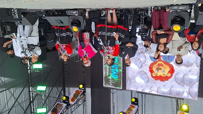 An outdoor stage event is in progress in José Luis Bustamante y Rivero, Peru. The scene features a central group of performers and supporting personnel on a stage with a black backdrop. Three individuals in traditional attire are prominently positioned, holding microphones and appearing to sing or address an audience. Two females wear red embroidered blouses, black skirts, and patterned shawls; one male wears a pink poncho, a patterned hat, and patterned trousers. To the left of the performers, a male in a dark suit, red tie, and gold lapel pin stands, smiling. Further left, a female in a red jacket and another in a dark red top and trousers are seated on the stage. A male in glasses stands behind them, looking at a mobile phone. On the right side of the stage, a male in a white jacket operates a camera mounted on a tripod, pointed towards the left. Another male in a grey t-shirt and tactical vest stands nearby. In the background, a drum set and sound mixing equipment are visible with another individual. The stage is equipped with overhead metal trusses supporting multiple yellow and green stage lights, as well as two large LED screens. The left screen displays a cartoon lion mascot with a red mane and blue jacket against a bubble pattern. The right screen shows "STAR" with accompanying graphics. Floor-level stage lights and speakers are also present.