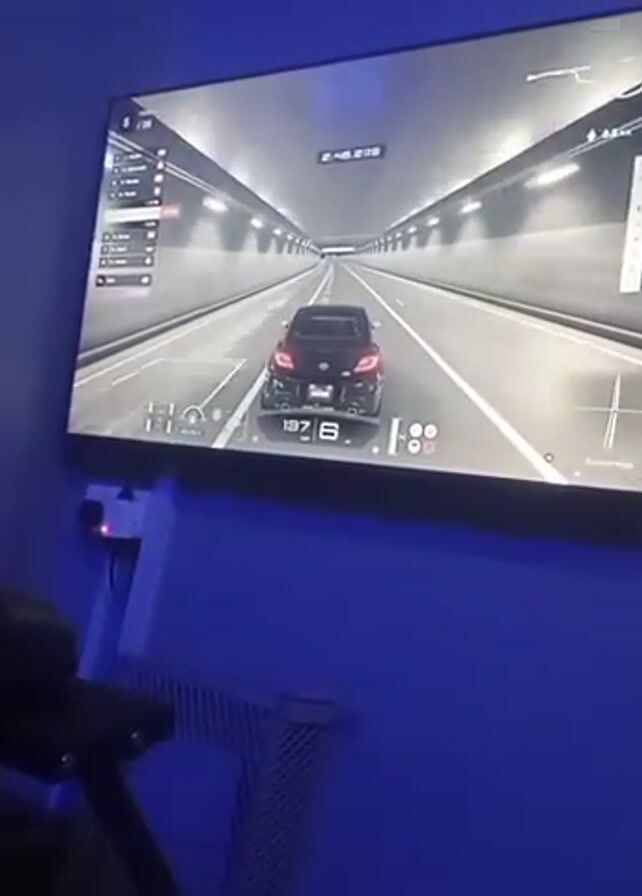 A person is playing a racing video game on a simulator. The game is displayed on a large TV mounted on a blue wall. The person is holding a steering wheel attached to a rig. The game shows a black car driving through a tunnel. A list of lap times is visible on the right side of the screen. A white radiator is visible under the TV. The room appears to be dimly lit.