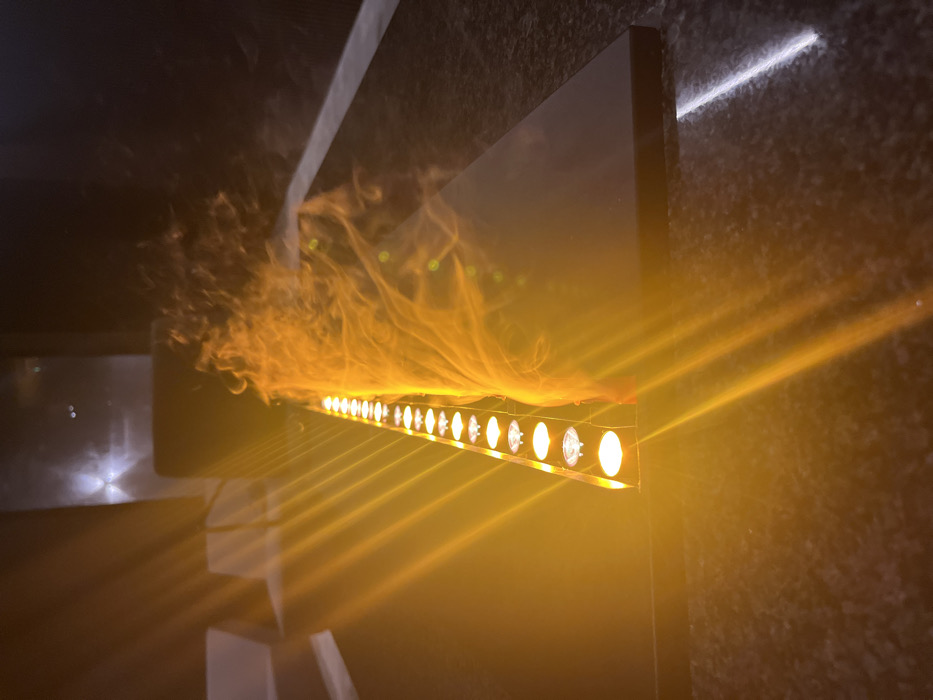 The image displays an indoor, dimly lit, modern environment located in Sofia, Bulgaria. A linear light fixture, containing approximately two dozen individual warm yellow-orange LED lights, extends horizontally across the left side of the frame, receding into the background. Immediately adjacent to and originating from the light strip, a dynamic plume of yellowish-orange smoke or vapor flows horizontally to the right, illuminated by the light source. The lights cast distinct, parallel rays across the foreground, which consists of a dark, polished, granular surface resembling granite or a similar stone countertop. The background elements are dark and indistinct, suggesting minimalist interior architecture. No individuals or specific actions are discernible within the scene.