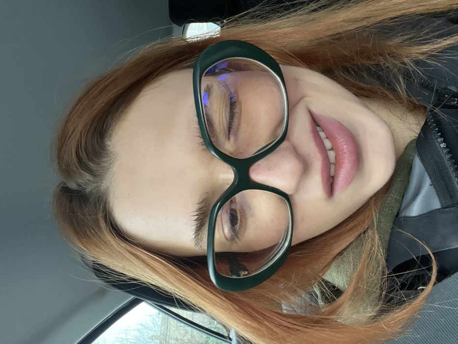 close-up portrait of a young adult female with long, reddish-blonde hair, seated inside a vehicle in Pantin, France. She wears oversized, dark green, oval-shaped eyeglasses, with reflections of blue and white light visible on the lenses. Her right eye is open and directed slightly downwards, while her left eye is closed in a wink. Her lips are parted in a slight smile, revealing upper teeth and are tinted pink. She is dressed in a dark, zip-up jacket over a hooded garment, possibly green. The background visible through the vehicle's window on the left is blurred, showing bare tree branches against a light sky, indicative of an urban outdoor environment. The vehicle's dark interior is visible on the right.