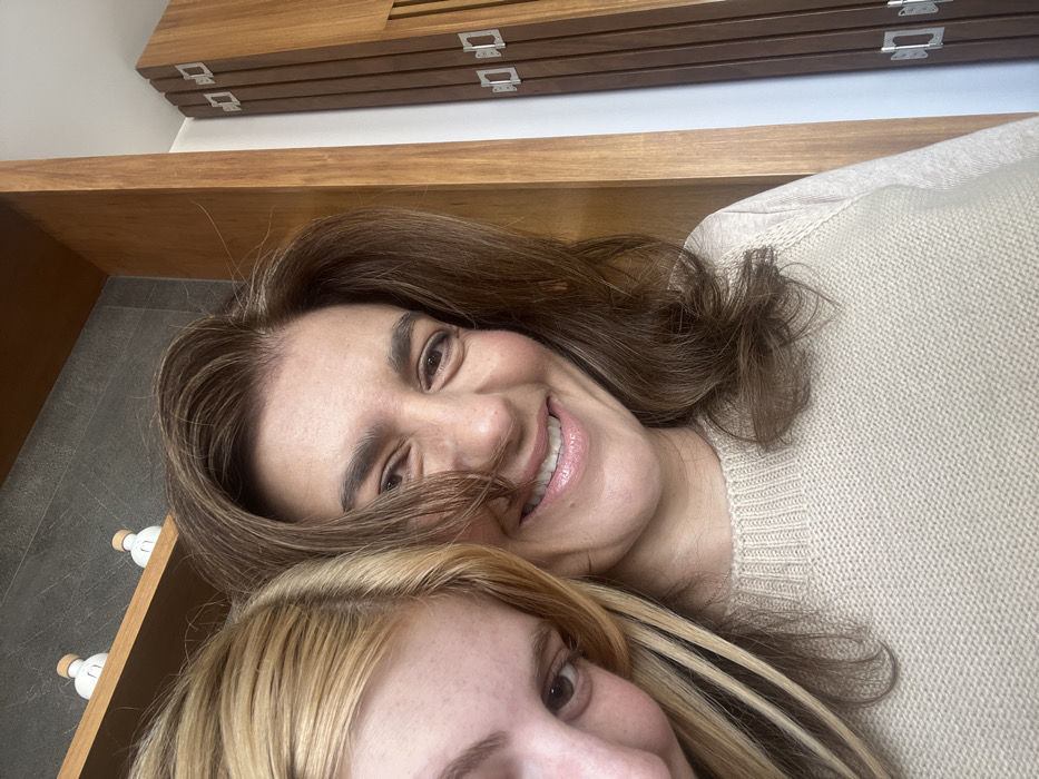 Two women are closely positioned, taking a selfie. One woman has shoulder-length, light brown hair with strands across her face. She's smiling, wearing a light beige sweater. The other woman has long blonde hair and is positioned at the bottom of the frame. Above them is a wooden shelf, and above that are several wooden planks with silver clasps. A shelf holding white bottles is visible to the left.