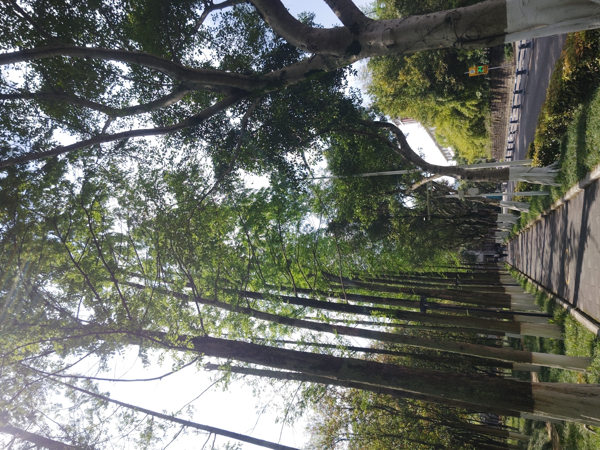 The image depicts a sidewalk lined with trees. The trees appear to be arranged in a linear fashion, creating a corridor effect. The trunks of the trees are partially painted white. The sidewalk is paved, and there is grass on either side. In the background, there is a road with a speed limit sign (possibly "30"). The scene is in an outdoor setting, presumably during daylight. Based on the prompt, the location is in the Chongqing High-tech Zone, China. There are no discernible people or specific actions captured. The scene consists of a natural urban landscape with maintained vegetation and infrastructure.